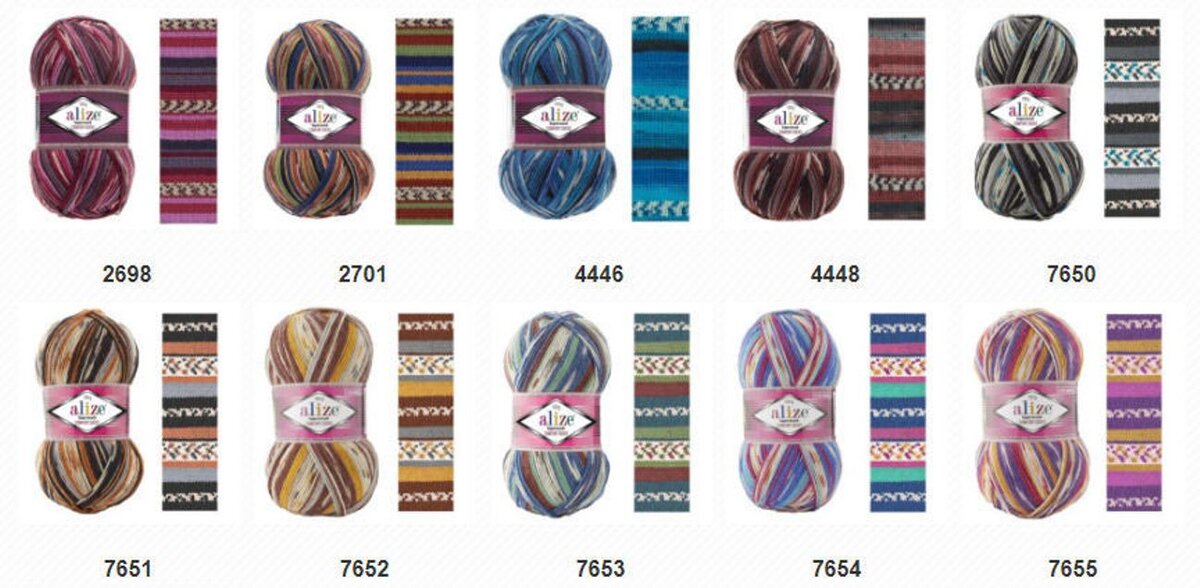 Так же можно использовать и другую секционную пряжу, например Nako Boho (тоже носочная пряжа) 100 г/400 м, Socks Himalaya и Socks Bamboo Himalaya (носочная пряжа) 100г/400 м, Vita Brilliant Print 100 г/380 м, Lanoso Papillon Batik 50 г/210 м, Alize Baby Wool Batic 50 г/175 м или любую другую, нужно лишь будет подобрать спицы под заявленную плотность вязания, если метраж пряжи будет сильно отличаться от метража пряжи, используемой в описании.