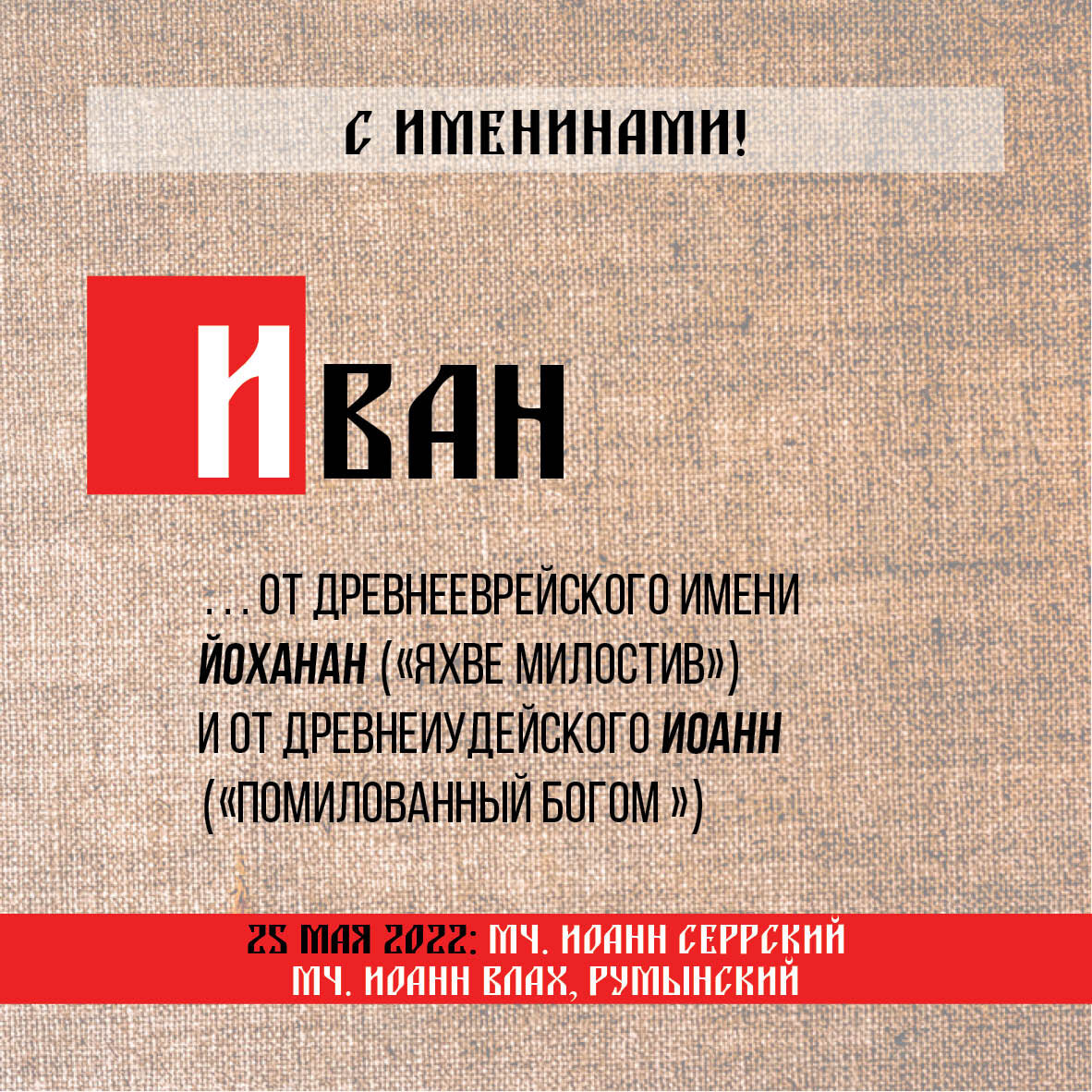 В этот день именины у мужчин с именами Герман, Гермоген, Денис, Епифаний, Иван, Панкрат, Пётр, Полувий, Савин, Семён, Феофан, Фёдор и Филипп. ГЕРМАН: от римского родового имени, восходящего к Germanus, что на латыни означает «близкий», «единоутробный», «родной». Память 25 мая 2022 г.: свт. Герман, патриарх Константинопольский ГЕРМОГЕН, ЕРМОГЕН или ЭРМОГЕН: древнегреческое имя, означающее «рождённый Гермесом», «потомок Гермеса». Память 25 мая 2022 г.: Сщмч. Ермоген, патриарх Московский и всея Руси ДИОНИСИЙ или ДЕНИС: от древнегреческого Дионисиос («принадлежащий богу Дионису»). Память 25 мая 2022 г.: прп. Дионисий Радонежский ЕПИФАНИЙ или ЕПИФАН: от дневнегреческого Епифаниос («явлённый», «знатный», «видный»). Память 25 мая 2022 г.: Свт. Епифаний Кипрский, епископ, прп. Епифаний Премудрый, Радонежский ИВАН: от древнееврейского имени Йоханан («Яхве милостив») и от древнеиудейского Иоанн («помилованный Богом»). Память 25 мая 2022 г.: мч. Иоанн Влах, Румынский, мч. Иоанн Серрский ПАНКРАТИ