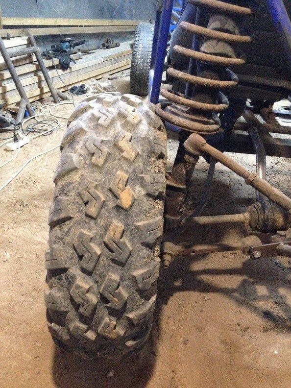 Всем привет! Третья часть закончилась на том, что я укоротил длину багги и доделал рулевое управление. Частично сделал педальный узел. Взял у знакомого покрышку от квадроцикла. Решил примерить, как будет выглядеть и влезет ли вообще, потому что планировал покупать новый комплект подобной резины от квадроцикла. В итоге оказалось то, что резина упирается в чашку с пружиной задней подвески. Проставки ставить не хотелось, и в голову пришла мысль спилить чашку и развернуть ее в другую сторону от колеса. После обварил и усилил чашку. Таким способом успешно решил проблему. Сразу же заказал резину и купил комплект дисков, чтоб сделать из них разварки нужной ширины под резину от квадроцикла. Честно. На сколько расширял, уже не помню. Но замерял на резине посадочное место линейкой и смотрел, на сколько оно шире диска. Зачистил и покрасил диски. После сразу же повез одевать резину и ставить колеса на багги. Не терпелось увидеть общий вид. Багги сразу преобразилась, стала по выше. Мне очен