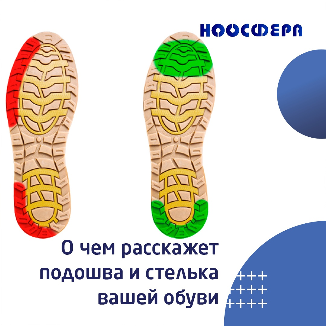 А вы когда-нибудь обращали внимание на состояние подошвы и стельки вашей обуви? Вы удивитесь, но по их износу можно даже поставить предварительный диагноз. Посмотрите на картинку, иллюстрирующую износ обуви здорового человека. Обувь здорового человека изнашивается только на носке и пятке. А теперь взгляните на стельку своей обуви и оцените, в каких местах она больше всего изнашивается. Теперь обратите внимание на подошву: износ наружного края обуви - признак деформации арки стопы, которая впоследствии может привести к косолапости; О чем рассказала вам подошва и стелька вашей обуви? Делитесь в комментариях. *Обнаружили тревожные признаки патологических процессов? Запишитесь на консультацию к специалистам клиники «Ноосфера», и узнайте причину возникновения этой проблемы. *В нашей клинике вы сможете заказать индивидуальные ортопедические стельки, изготовленные по вашему слепку стопы Запишитесь на приём в "Ноосферу" со скидкой 85% и начните борьбу с первопричиной проблемы при помощи самых