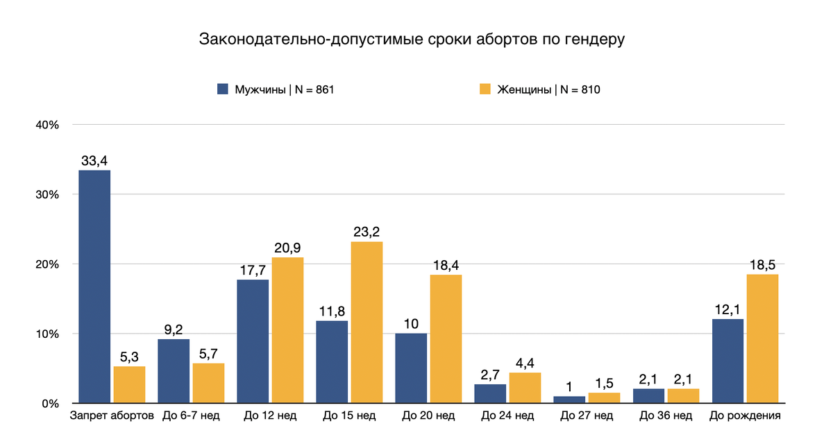 Недавно я провела опрос на тему допустимых сроков абортов. Конечная выборка составила 1671 человек, что с высоким доверительным интервалом[>95] может отражать среднестатистическое мнение большинства русскоязычного населения до ~45 лет.