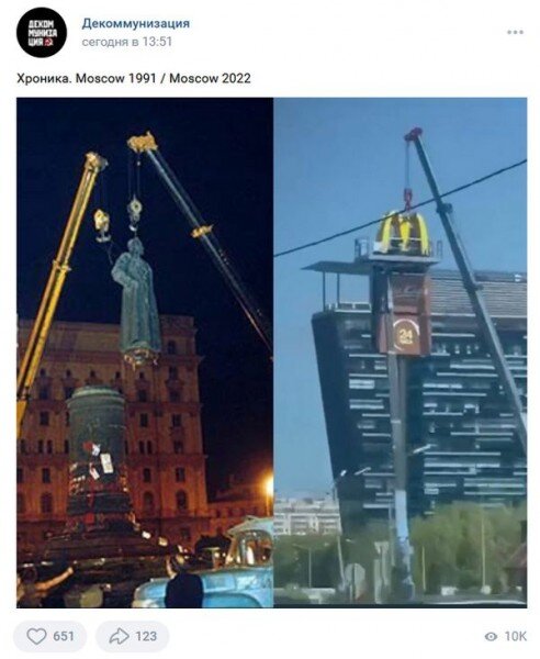 Из России окончательно уходит сеть «Макдоналдс», закрывшая свои заведения после начала СВО, сносят символику МакДака на улицах. Аккаунт «Декоммунизация» скорбит по этому поводу: Но только господа декоммунизаторы, как всегда, чуточку передёргивают. Если бы слева они поставили картинку открытия первого «Макдоналдса» в Москве на Пушкинской площади, а справа снос маковской символики, всё было бы верно. Вот эту фотографию 31 января 1990 года, открытие первого «МакДака» в СССР: Но они ставят слева снос Железного Феликса на Лубянке в августе 1991 года. Тогда справа, по логике, должно стоять восстановление этого же памятника на прежнем месте, не так ли? А этого пока что нет. Значит, нравится это кому-то или нет, но эпоха «снесённого Феликса», которую в этом блоге я называю Реставрацией, продолжается. Ну да, теперь без «Макдоналдса», а кто сказал, что именно он был её главной сущностной приметой?