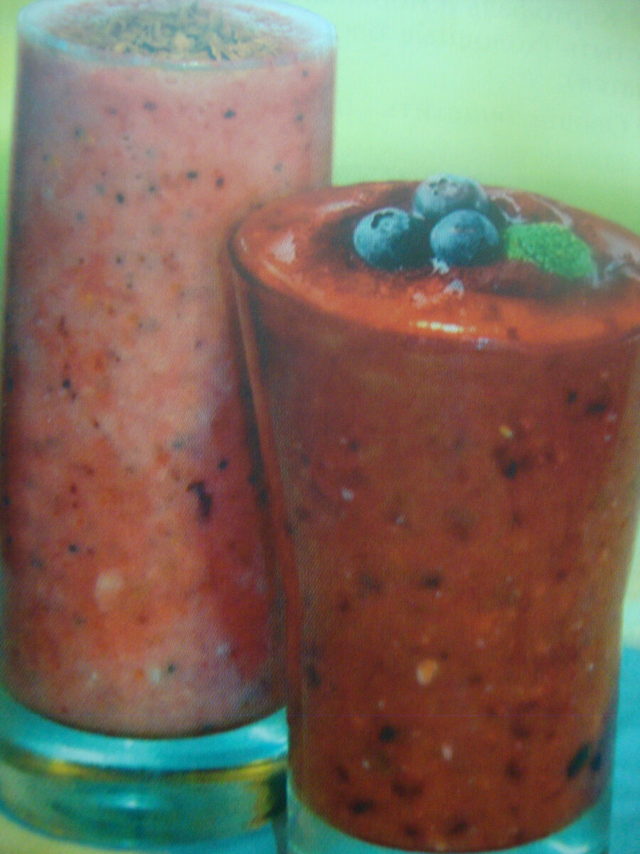 Для ягодно-фруктовых коктейлей лучше подойдут кисло-сладкие сочетания:например,смородина+яблоко или клубника +вишня. В зимнее время можно использовать замороженные фрукты и ягоды. Ягоды и фрукты измельчить блендером до однородного состояния. Дополнить вкусовой букет можно любыми соками,медом или сахаром,халвой,ореховой пастой,шоколадом,орехами. Тщательно перемешать и взбить коктейль, разлить в бокалы,украсить половинками клубники,листочками мяты,тертым шоколадом. Удачные сочетания: БАНАН+КИВИ+ОВСЯНАЯ КАША; ВИШНЯ+КЛУБНИКА+ХАЛВА(любая); Вкус напитка зависит от спелости фруктов -совершенствуйте его по ходу приготовления. Замените соки йогуртом, сливками, молоком и творогом. В качестве украшения можно использовать мороженое.