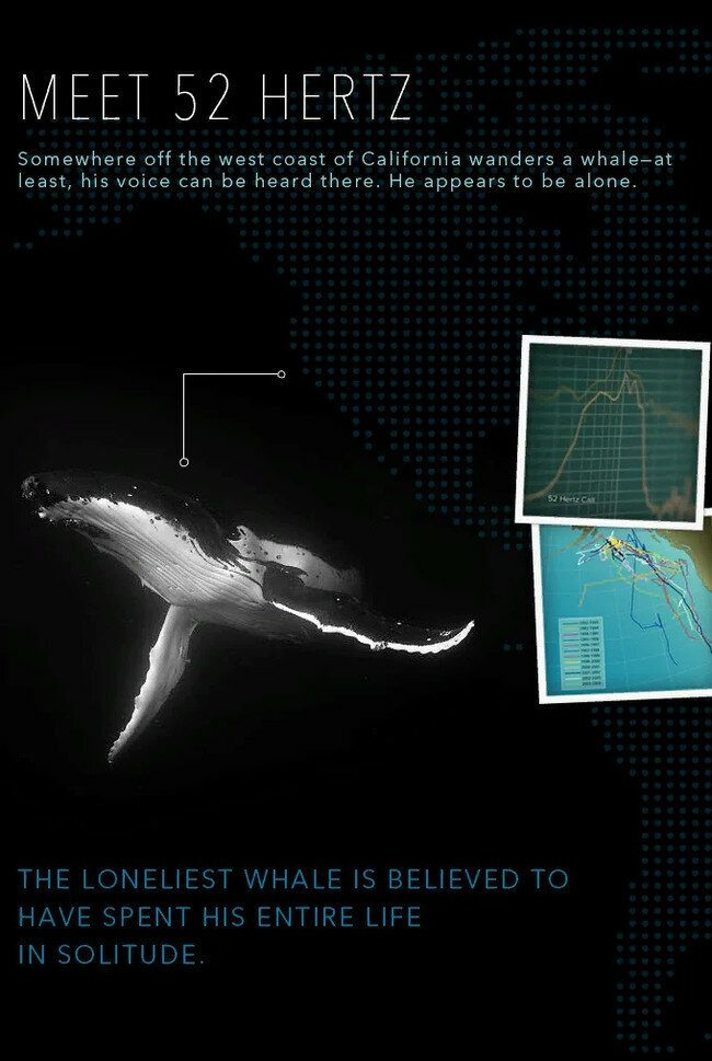 А Вы знали, что Самый одинокий кит в мире - это кит 52 Герца, он поет свою песню, но никакой другой кит ему не будет отвечать, так и продолжается его путешествие по морям и океанам в полном одиночестве. Не то, что он не пытается общаться с соплеменниками. Он делает это постоянно. Но кит поет так высоко, что на этой частоте звука никакой другой кит не сможет ответить. Свое прозвище - 52 Герца он получил из-за частоты в 51,75 Герц, на которой он издает свои сигналы. Проблема в том, что остальные киты общаются на частотах 15-25 Герц, т.е. услышать никто из них его никогда не сможет.