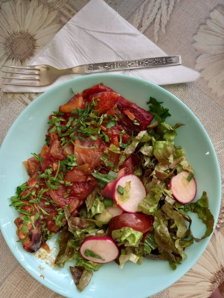 #пп С моей точки зрения блюдо полезное, вкусное, быстрое, что очень важно. Кроме того все продукты вполне доступны. Ингредиенты: Скумбрия, Луковица, Помидоры консервированные , Специи : соль, перец, прованские травы Способ приготовления: Лук очистить, нарезать полумесяцем, высыпать на дно формы для запекания. Помидоры порезать кусочками, у меня заготовка с печеным болгарским перцем. Распределить сверху лука. Тушку скумбрии разделить на два филе, очистить от костей. Кладем рыбу сверху на овощи, посыпаем специями и запекаем в разогретой на 180 гр духовке около 20 минут. Подаем со свежим салатом. Невероятно вкусно!
