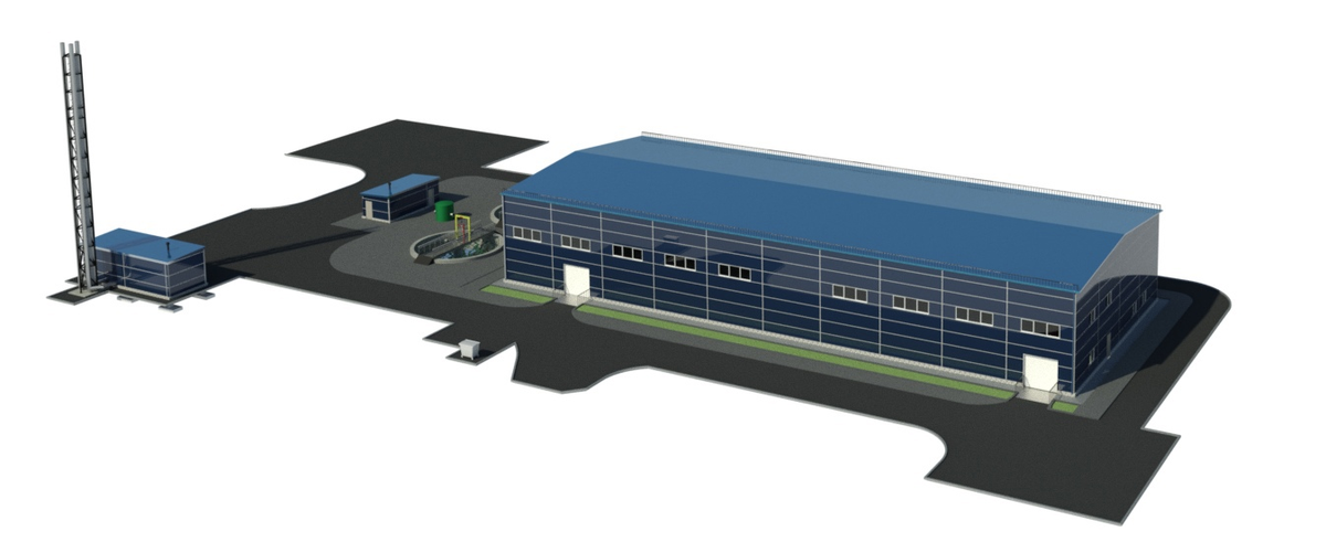 Для размещения технологического оборудования разработали производственное здание из металлокаркаса и сэндвич панелей, в целях уменьшения металлоемкости здания.
