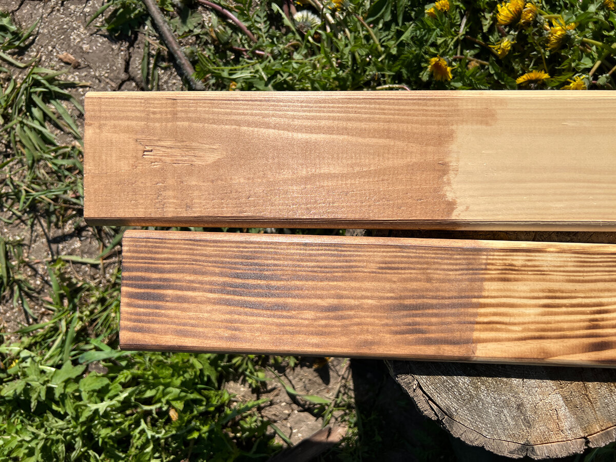 Приветствую! В нашем домике при строительстве окна обрамляли в так называемый деревянный корпус и вставляли в стену, как в деревянном конструкторе. Естественно ни о какой эстетичности речи нет. Поэтому решили как-то облагородить окна. Купили наличники, нарезали и встал вопрос как и чем красить. Стены покрашены белым маслом, и чтоб выделить окна, решил сделать их темного оттенка. Как раз осталось масло которым мы покрывали полы и балки потолка. Но папа ещё предложил обжечь их горелкой чтоб выделить фактуру дерева. Для сравнения сделали 2 варианта: Обожженный вариант смотрится интереснее Когда всё подсохло, прибили на места Спасибо за внимание!