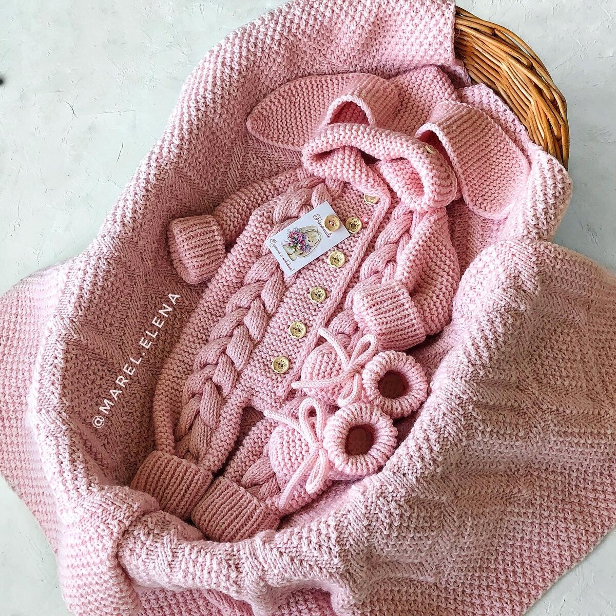 Вяжем,вяжем,вяжем 🧶) Очередной жемчужно-розовый комплект отправлен. В комплекте: Комбинезон на 3/6 с ушками зайчика + ромбовый плед + пинетки. #комбинезон_косы_MAXI_от_marel #комбинезончик_от_marel #детский_плед_от_marel —————————- #вязаный комплект на выписку #вязаный комбинезон #комплект для новорожденного