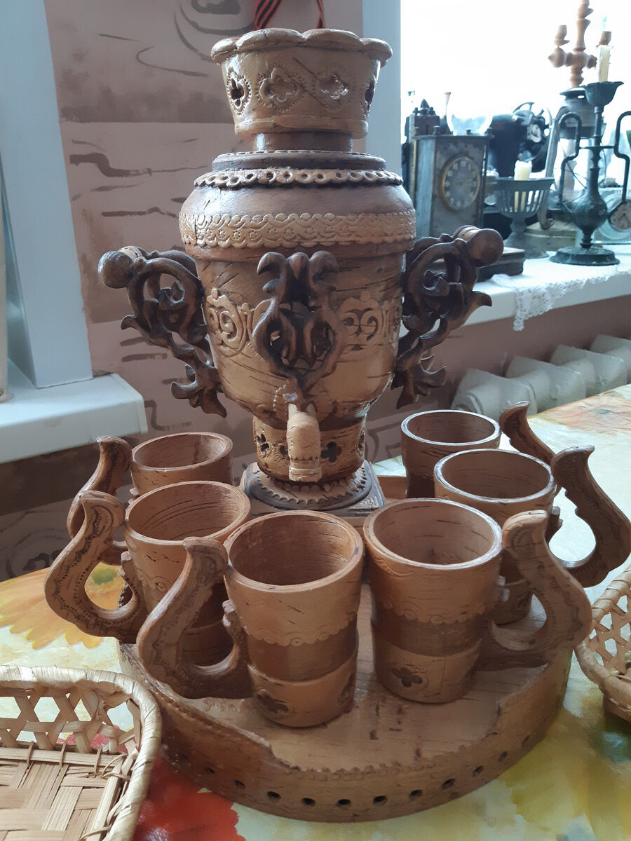 Недавно побывала в сельском музее, очень понравился такой самовар и кружки из бересты.