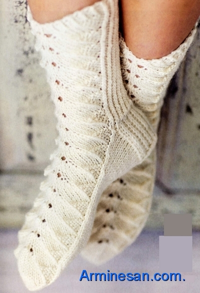 очаровательные носочки с рельефным рисунком в вашу коллекцию. азмер: 38-39 Вам потребуется для носков: пряжа Novita 7 Veljesta (75% шерсть, 25% акрил, 100 м/50 г) – 100 г белого цвета (010); чулочные спицы №3,5. Резинка 1х1: *1 лиц. п. за заднюю стенку, 1 изн. п.* повторите *-*. Лицевая гладь: при круговом вязании только лиц. петли. Рельефный узор: ширина узора 23 п. 1-й ряд: 5 изн. п., 6 лиц. п., накид, 1 лиц. п., накид, 6 лиц. п., 5 изн. п. 2-й ряд: 4 изн. п., 2 лиц. п. вместе, 5 лиц. п., накид, 3 лиц. п., накид, 5 лиц. п., протяжка (=снять 1 п., не провязывая, провязать 1 п. и протянуть ее через снятую петлю), 4 изн. п. 3-й ряд: 3 изн. п., 2 лиц. п. вместе, 5 лиц. п., накид, 5 лиц. п., накид, 5 лиц. п., протяжка, 3 изн. п. 4-й ряд: 2 изн. п., 2 лиц. п. вместе, 5 лиц. п., накид, 7 лиц. п., накид, 5 лиц. п., протяжка, 2 изн. п. 5-й ряд: 1 изн. п., 2 лиц. п. вместе, 5 лиц. п., накид, 9 лиц. п., накид, 5 лиц. п., протяжка. 6-й ряд: 2 лиц. п. вместе, 21 лиц. п., протяжка. Повторять 1-6
