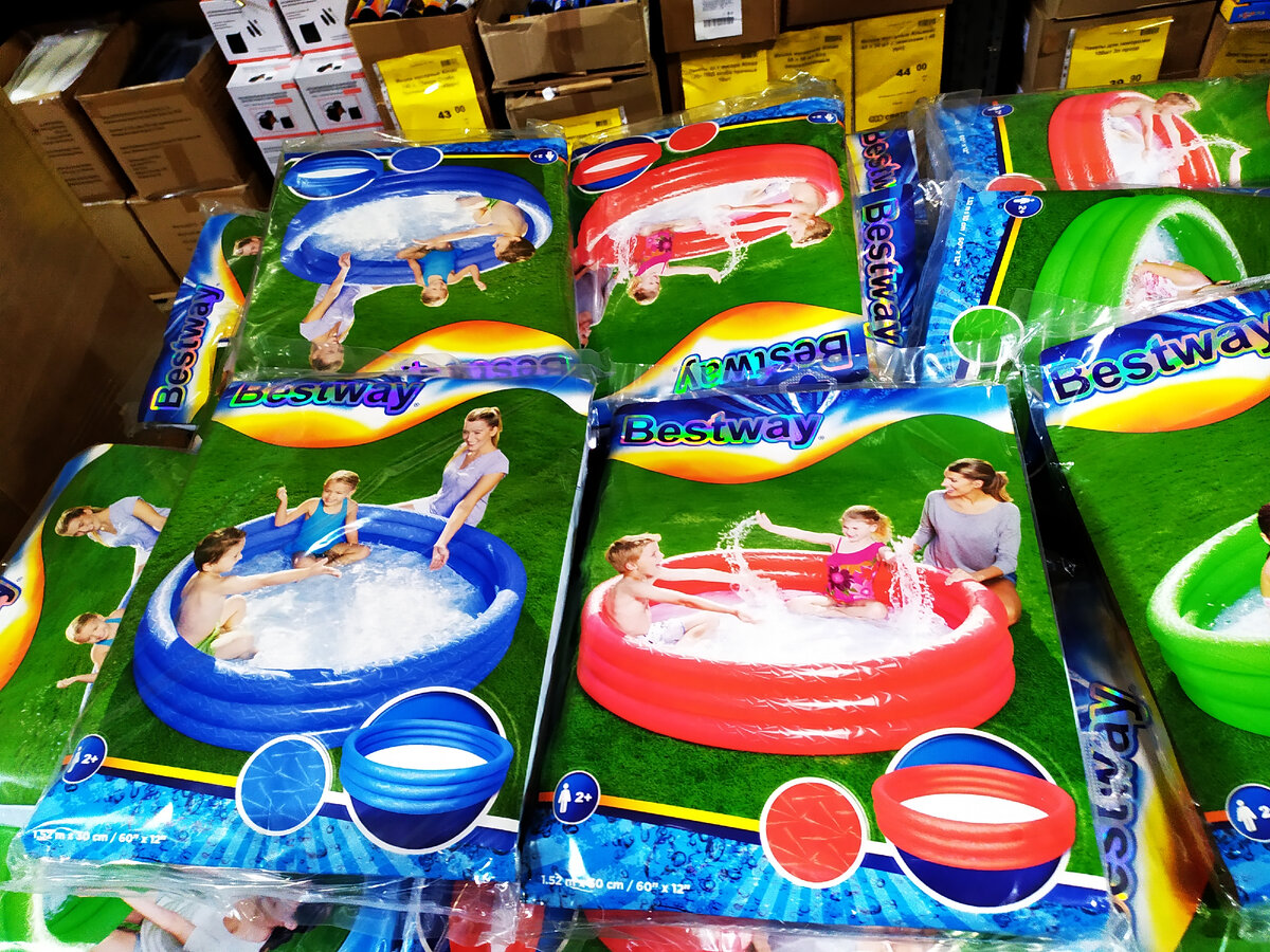 Я собралась с семьёй немного отдохнуть. Конечно не у вех есть возможность купить и установить в своём дворе большой бассейн из "Светофора". Но в продаже есть и маленькие для детей, которые очень мобильны и занимают мало места. И естественно после водных процедур, хочется покушать. Всё это мы купили в "Светофоре" и я делюсь с вами в этом обзоре. Надувной детский бассейн на 282 литра разных цветов, размером 152/30 см. Цена 699 рублей. Большой бассейн с быстрой установкой на 3638 литров, размером 305/76 см. Цена 4379 рублей. Надувной односпальный матрас Bestway, размером 185/76 см. Цена 944 рубля. Пищевая пластиковая бочка на 20 литров для засолки с гнётом и герметичной крышкой. Цена 580 рублей. Походный рюкзак на 85 литров с увеличивающимся дном и крепежом. Цена 813 рублей. Теннисный набор с сеткой. Цена 295 рублей. Молоко цельное сгущённое с сахаром, в мягкой упаковке массой 280 грамм. Цена 68 рублей. В вакуумной упаковке свиная шинка "Белорусская". Цена 378 рублей за 1 кг. Копчёные ку