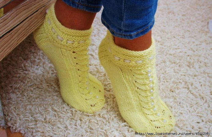 Далее вяжем на 2-х спицах (26 петли) лицевые петли, а на двух (22 петли) — узор (это верх тапочка).