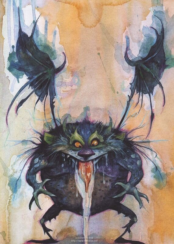 Навстречу им уже семенил анчутка с барахтающейся в руках несуразной сущностью, собравшей в себе гротескный набор демонических атрибутов, как-то: рога, крылья с перепонками и крючками, козлиная бородка, голое пузо и редкая шерсть, торчащая жалкими пучками. Завершал сей образ недоразвитое рыльце паршивого поросенка и оскал торчащих зубов, тронутых кариесом. Взгляд сущности в руке анчутки, сжимавшей шею, становился туманно -жалостливым.