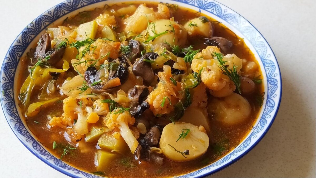 На сковороду влить растительное масло и разогреть. Выложить в горячие масло лук и морковь обжарить на среднем огне, постоянно помешивая, в течение 3 минут. Грибы почистить и хорошо промыть. Грибы нарезать произвольным образом. Добавить на сковороду и обжарить с луком на среднем огне, периодически помешивая лопаткой в течение 2 минут. Помидоры нарезать кубиками добавить в сковороду. Помидоры слегка обжарить на сковороде. Кабачки нарезать небольшими кубиками. В это время нарезать капусту, добавить в кастрюлю. Цветную капусту разделить на части и добавить в кастрюлю. Картофель порезать на части, добавить в кастрюлю. Соединить все овощи, в кастрюле. Влить томатный сок или томатную пасту с водой разбавить. Накрыть крышкой и т