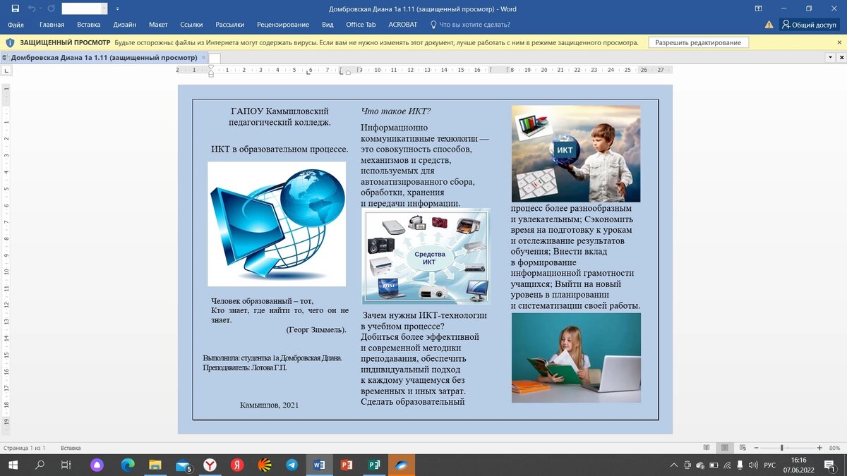 На следующих занятиях мы узнали ещё больше о возможностях MS Word, как оказалось, в нем даже можно создавать буклеты. Задание: Создать буклет в программе Microsoft Office Word на тему "Использование средств ИКТ в различных сферах деятельности" Буклет — вид печатной продукции, характерный для рекламной полиграфии, имеющей внешнюю схожесть с брошюрой, но обычно более сложной конструкции и проработанного дизайна. Как создать буклет и какие фишки можно использовать при его создании, вы можете узнать из предложенного видео-урока: Так же, вы можете посмотреть пример моей работы, буклет выполнен на тему: "ИКТ в образовательном процессе". Скачать мою работу вы так же можете, перейдя по ссылке ниже: #ms word #буклеты