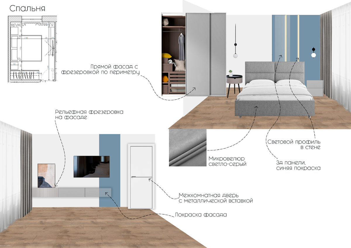В этой статье покажем вам спальню, которая получилась у нас из проекта однушки 35м2. Другие помещения можно посмотреть по этой ссылке. Спальня была с небольшими корректировками, в целом решение дизайнеров заказчику понравилось. Был предложен вот такой эскиз: Была единственная корректировка - изменить цвет акцента в комнате. Тогда мы решили поискать и предложили несколько вариантов: В итоге заказчиком был утвержден желтый вариант. Спальня стала продолжением общей цветовой концепции остальных помещений в квартире. Видите 3д панель за изголовьем кровати? Напротив кровати эти вертикальные полосы поддерживает фасад тумбы подобного вида, но при этом не акцентирует внимание Также как и в прихожей, красим часть фасада и каркаса подвесной тумбы, тем самым сливаем её вместе со стеной 🔥 Ну и показываем остальные ракурсы: Как вам такая спальня? Осмелились бы на такие яркие акценты? _______________________________________________________________________ Выполним для Вас уникальный дизайн-проект
