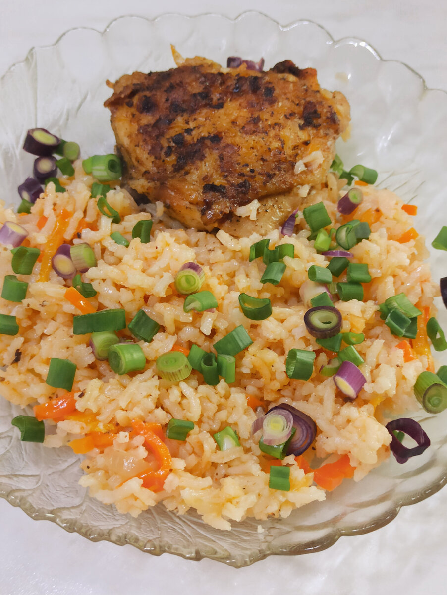 Куриные бёдра с рисом на сковороде. Невероятно лёгкое в приготовлении блюдо, а главное бюджетное и очень вкусное. Начнём с подготовки основных ингредиентов. Бедрышки солим, перчим, добавляем любимые специи и по желанию майонез. Оставляем мариноваться на пол часа. Далее про маринованные бёдра обжариваем на отдельной сковороде, на сильном огне с двух сторон до образования румяной корочки, обязательно под крышкой. Выключается огонь и оставляем румяные бедрышки пока отдохнуть. Тем временем нам понадобится одна крупная морковка и луковица. Овощи чистим, нарезаем морковь соломкой, лук полукольцами и обжариваем в глубокой сковороде в которой будем готовить наше блюдо. Когда овощи почти готовы, выкладываем туда же два стакана промытого риса и продолжаем обжаривать минутки две, три. Затем не забываем посолить и добавить немного перчика. Туда же закидываем одну столовую ложку томатной пасты. Всё ещё раз хорошенько перемешиваем, разравниваем и выкладываем наши бедрышки по верх риса немного