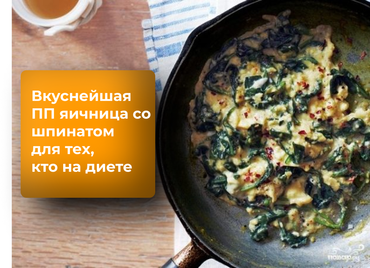 Все мы дамы любим на завтрак отведать сладенького, но к сожалению это все откладывается на нашем с вами теле. Поэтому я решила поделиться с вами рецептом вкуснейшей яичницы со шпинатом, которая точно не оставит след на вашей талии! Ингредиенты на 2-ве порции: Яйца - 4 штуки Шпинат, пучок - 1 штука Оливковое масло - 1 Ст. ложка Соль - по вкусу Сыр тертый - 1-2 ст лодка Перец черный молотый - по вкусу Рецепт приготовления: 1. Шпинат промойте, если надо, и просушите на бумажном полотенце. Понадобится большой пучок шпината, имейте ввиду, что в приготоволенном виде шпинат в раза 2-3 сжимается. 2. В сковороде на среднем огне разогрейте оливковое масло. Выложите в разогретую сковороду шпинат и, помешивая, жарьте в течение одной минуты. Пока масло нагревается и шпинат жарится, в миске слегка взбейте с солью яйца. 3. Яйца добавьте к обжаренному шпинату если хотите, перемешайте. Жарьте на средне-медленном огне до готовности яиц. В конце жарки добавьте молотый перец по вкусу. 4. Выключите огонь