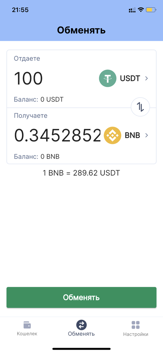 Для того, чтобы сделать обмен необходимо перейти в раздел “Обменять”, из списка выбрать активы которые вы хотите свапнуть, ввести количество и нажать на кнопку “Обменять”.