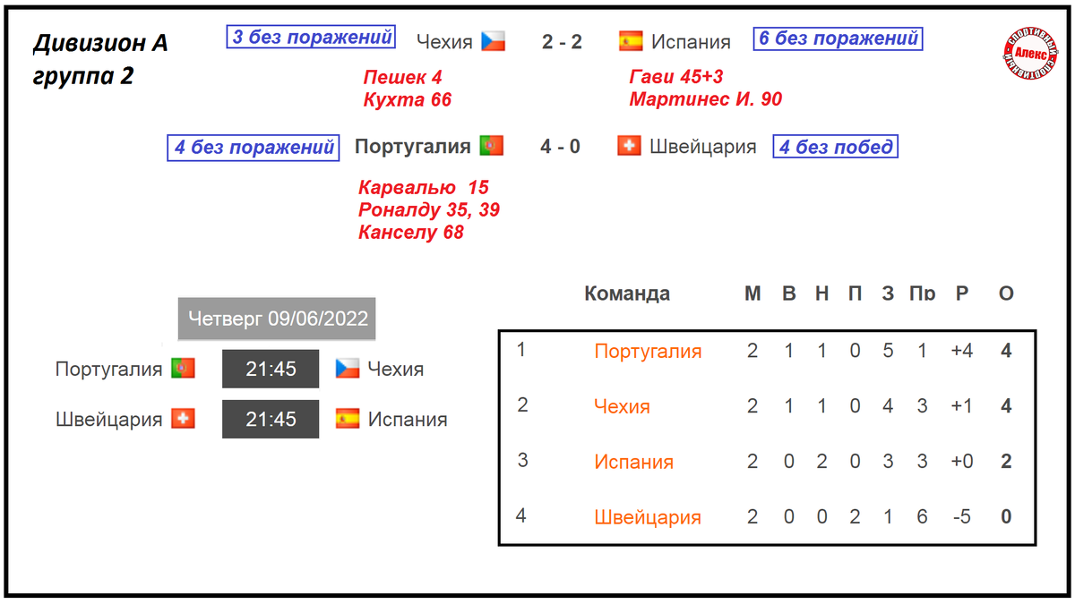 Смотрим все результаты пятого дня в Лиге Наций. Какие изменения произошли в таблицах, сколько голов стало у Роналду, какой рекорд установил Месси, как завершилась игра Мальты и Сан-Марино? Испания в конце спаслась с Чехией (2:2). В 1996 году команды последний раз сыграли между собой вничью. С тех пор – сплошные поражения чехов. 25-летний нападающий Локомотива Ян Кухта заработал 2 очка (гол + пас). Чехия не проигрывает 3 матча во всех турнирах. Испания не проигрывает 6 матчей (4 победы и 2 ничья). Португалия раскатала Швейцарию 4:0. Ещё два гола отменила система VAR. Напомню, команды встречались в полуфинале первого розыгрыша Лиги Наций. Коллектив Сантуша выиграла 3:1, а затем взяла кубок. 37-летний Роналду записал на свой счет 2 мяча и передачу. В общей сложности на его счету 117 голов за сборную. У команд серии из 4-х матчей, но Португалия не проигрывает, а Швейцария не выигрывает 4 игры. Расписание. Португалия – Чехия, Швейцария – Испания. Игры состоятся 9 июня. Таблица. После двух