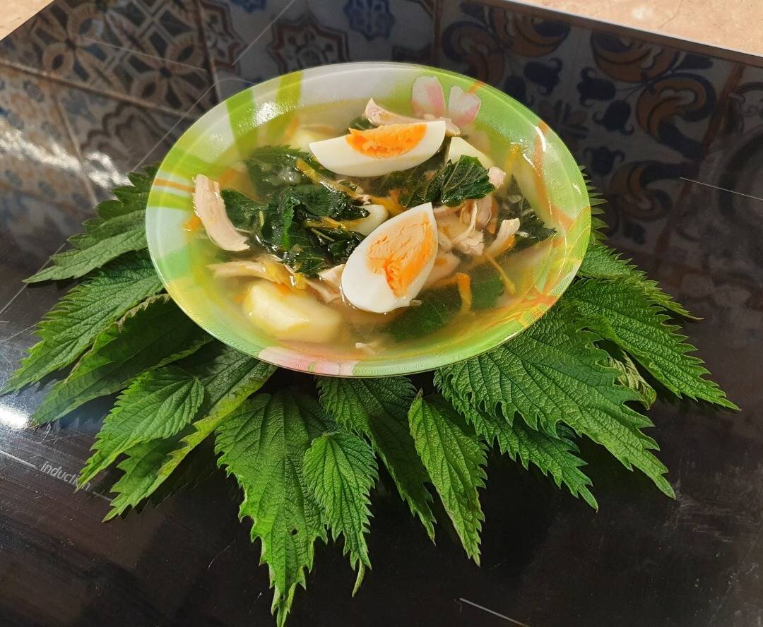 Крапива очень полезное растение. Предлагаю вам очень простой и вкусный суп с листьями крапивы. Ингредиенты: листья крапивы, куриных голени, картофель, морковь, лук , яйцо Способ приготовления: Для начала необходимо собрать хороший пучок крапивы на даче. Не собирайте крапиву вдоль трассы! Желательно чтобы крапива была молодой. Чтобы не получить ожоги работать с растением лучше всего в перчатках. Отделить листья от стеблей. Листья очень хорошо вымыть и обсушить. Сама по себе крапива не дает как токового вкуса, по этому, вкус будем формировать вкус из бульона. Ставим варить курицу, можно добавить, морковь и лук. Периодически убираем пену шумовкой. Пока вариться бульон, натрем морковь и мелко нашинкуем лук для пассировки. Овощи немного обжарим. Картофель нарезать на произвольные куски. После того как курица сварилась, вынимаем ее из бульона и разбираем на волокна. В бульон отправляем картофель минут через 5 добавляем пассеровку и курицу. Солим и перчим, варим еще около 5 минут. Листья крап