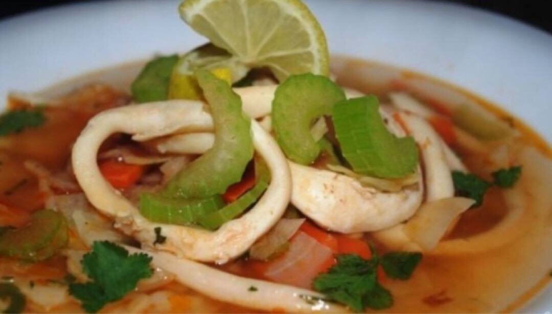 Очень вкусный!. Ингредиенты: Кальмары , Брокколи, Сельдерей, Морковь, Помидор, Лук, Зелень, Соль, перец, Оливковое масло Способ приготовления: Кальмары сложить в миску и залить кипятком, тщательно перемешать и слить. Порезать кальмары кружочками или соломкой, отложить пока в сторону. Брокколи промыть и разобрать на соцветия. Морковь очистить и натереть на крупной терке. Стебель сельдерея порезать полукольцами. Лук очистить и мелко нарезать (тонкими четвертинками). Помидор вымыть, порезать небольшими кусочками. На сковороде разогреть 10 мл растительного масла и пассеровать на слабом огне морковь с луком, непрерывно их помешивая. Добавить в сковороду помидор и перемешать, готовить еще пару минут. Налить в кастрюлю воду. Как закипит забросить брокколи и сельдерей варить мин 10 - 15. Добавить в кастрюлю пассерованные овощи. Готовить овощной суп 5 минут при слабом кипении, добавить кальмаров, посолить, поперчить по вкусу и готовить еще минуту на небольшом огне. Зелень промыть и нашинковать,