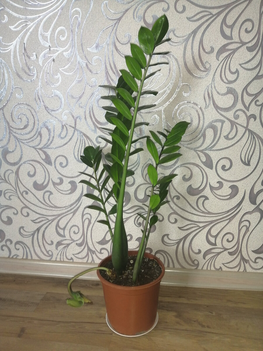 Здравствуйте дорогие друзья. Ранее я писала пост про то, как зацветал мой замиокулькас (доллоровое дерево): С тех пор прошло 3 месяца. Вот так растение выглядит сейчас: Новых листьев цветок не дал, к тому же один лист засох. Цветок наклонился вниз спустя 2 недели цветения и, с тех пор, так и выглядит. Немного только подсох (на фото это место обвела) И вот на днях заметила, что растение дало побег. При этом достаточно интересно, не от основания корневища, а из пазуха цветоноса. Теперь буду наблюдать каким образом этот побег будет расти и развиваться. Подписывайтесь на мой канал, буду держать Вас в курсе😉. Лайки, комменты приветствуются😀.
