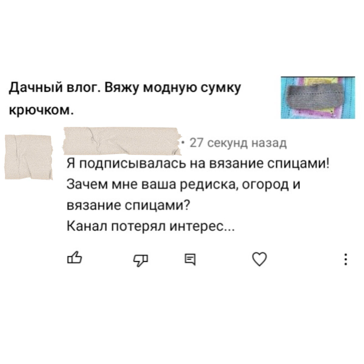 Всем привет! Вот такой комментарий прилетел мне на мой дачный влог. Когда я выкладываю скрины комментариев, я не закрываю ник и аватарку, НО этой даме не хочу делать рекламу ее канала. В начале видео, когда я вас приветствую, говорю: " Всем привет, добро пожаловать на мой канал, канал Ольги Ушаковой, канал о вязании и не только!" В этом комментарии скорее всего опечатка: "...вязание спицами?", я предполагаю - вязание крючком. Почему? Потому, что именно на видео, где я показываю вязание крючком и прилетел молниеносно комментарий. Я смотрю многих блогеров по интересам, и если мне не нравиться тема видео, я просто не смотрю, не пишу и жду интересной темы. А если вы подписаны на меня, то принимайте мой канал так, как я его веду! Если кто-то ждет от меня готовое изделие за 3 дня, спешу вас разочаровать, исключение может быть носки спицами или пинетки, когда у моего мужа выходной. У моего мужа редко выходные, 1 день раз в две недели и то, если повезет. Я не вяжу целыми днями от рассвета д