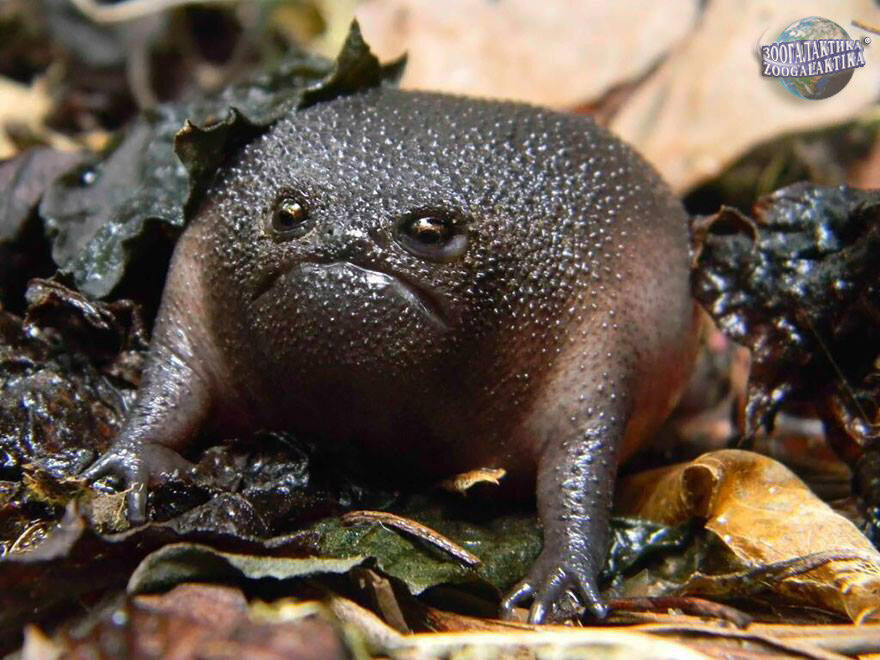 Эндемик Южной Африки из рода Африканских узкоротов. На самом деле она не злая, не грустная и не разочарованная, просто так выглядит. Лягушка примерно от 2 до 7 см в длину. Значительное время проводит в своем убежище и предпочитает выходить наружу в сумерки и в дождливую погоду. Как можно заметить по фотографиям, лягушка не приспособлена к прыжкам. По земле передвигается медленно. Благодаря своему окрасу малозаметна. Питается мелкими беспозвоночными вроде муравьев, бабочек, жучков, мокриц и т.д. Не смотря на то, что чёрные дождевые лягушки большую часть жизни проводят в своих норках, они довольно общительны друг с другом. А еще узкороты раздуваются до невероятных размеров и истерично пищат как котята в случае опасности.