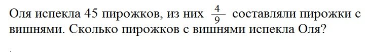 Нахождение дроби от числа Уважаемые мамы и папы, дедушки и бабушки! Предлагаю решение задач 394, 397 и 416 из 7-го издания учебника по математике для 6-го класса авторов А. Г. Мерзляка, В. Б. Полонского и М. С. Якира под редакцией. В. Е Подольского. Условие задачи 394: Решение: Такие задачи школьники решают в 5-ом классе: 1) 45 : 9 = 5 пирожков – одна девятая часть 2) 5 * 4 = 20 пирожков с вишней испекла Оля Ответ: Оля испекла 20 пирожков с вишней. При этом шестиклассники должны уметь сокращать в перемножаемых дробях числитель и знаменатель на их наибольший общий делитель – в данном случае у чисел 45 и 9 он равен 9. Вывод: чтобы найти дробь от числа, можно число умножить на эту дробь (§12). Условие задачи 397: Агрофирма владеет 140 га земли, 16% которой занимает яблоневый сад. Найдите площадь сада. Решение: Здесь тоже нам не нужно сперва делить на 100, а потом умножать на 16. Можно сразу 140 га умножить на 0,16. 140 * 16% = 140 * 0,16 = 22,4 га площадь яблоневого сада. Ответ: площад
