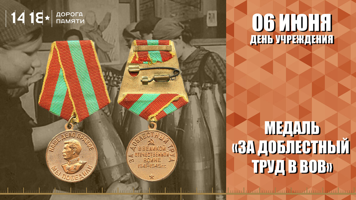 Медаль «За доблестный труд в Великой Отечественной войне 1941—1945 гг.» была учреждена Указом Президиума Верховного Совета СССР от 6 июня 1945 года. Авторами эскиза стали художники И. К. Андрианов и Е. М. Романов. Медаль изготавливалась из меди. На лицевой стороне профильное изображение Сталина в форме Маршала Советского Союза. В верхней части награды по окружности надпись: «Наше дело правое», в нижней части по окружности надпись «Мы победили».