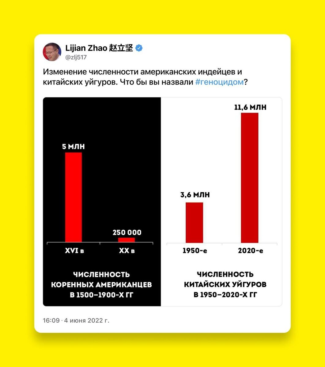 Китайцы рубят фишку в информационочке 😜 Пресс-секретарь китайского МИД Чжао Лицзянь наглядно продемонстрировал американцам (https://twitter.com/zlj517/status/1533062102147305472..) всю лживость их «заботы» о благополучии «угнетаемых» народов по всей планете. За 70 лет количество «подвергающихся геноциду уйгуров» в Китае увеличилось в три раза, а вот с индейцами в США, о геноциде которых никто в Америке не вещает, все как-то совсем грустно. Странно, что российская информационная машина не публикует ничего подобного. А ведь период «оккупации» СССР был не менее красноречивым для популяции всех народов проживавших в нем, чем китайская инфографика. Например, по Украине цифры численности населения в 1700 году аналогичны индейцам, но к 1900-му количество индейцев сократилось в 20 раз, а украинцев выросло впятеро, до 25 млн. За время же «советской оккупации» количество украинцев снова удвоилось, и самое невероятное, что даже во время «голодомора» наблюдался его рост. А вот за время «пребыв