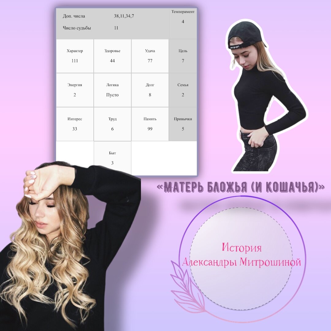 Как видите все ее профессии связаны с творчеством. Выбрав эти профессии, она не ошиблась ни разу (Интерес 33 + Логика пуст + Память 99) – творческая натура. Ее идеи не имеют границ, а тонкое понимание, как нужно сделать, всегда выстреливает на просмотрах. Знает, чем зацепить, как привлечь внимание аудитории (удача77/777 или 6/666).