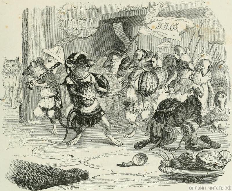 Мышь бедная давно жила в большой тревоге: Кот постоянно ей встречался по дороге, И сторожил ее на каждом он шагу. Чтоб в лапы не попасть врагу, Желая поступить разумно в деле этом, К соседке Крысе Мышь явилась за советом. Та Крыса у других слыла за образец, — Так велики ее все были совершенства. Себе жильем ее крысиное степенство Избрало чуть что не дворец; Она уж сотни раз хвалилась громогласно, Что не боялася ни кошек, ни котов, Ни их когтей, ни их зубов. «Сударыня, — так Крыса молвила, — напрасно Старалась бы одна Кота я победить, Который вздумал вам вредить; Но если б мы всех крыс собрали по соседству, То мы бы нанесли Коту большой урон». Тут Мышь отвесила почтительный поклон, А Крыса к своему спешит прибегнуть средству И к кладовой бежит, где той порой За счет хозяина у Крыс был пир горой. В волнении она не видит и не слышит И от усталости чуть дышит. «Что с вами?» — говорит одна из Крыс. А та в ответ: «Скажу вам покороче, Зачем я изо всей бежала мочи. Кот Раминагробис Стал ист