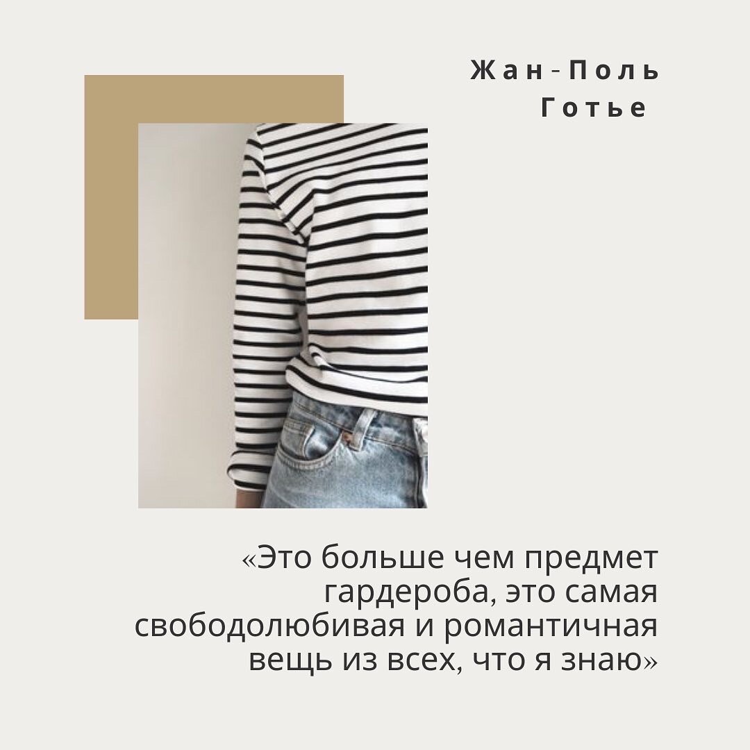 Сегодня расскажу о тельняшке, которая плавно перекочевала из гардероба моряков в наш👣 Тельняшка появилась во французской провинции Бретань. Ее шили из плотной бретонский шерсти для рыбаков, чтобы те не замерзали под морскими ветрами. В середине 19 века «бретонка» (второе название тельняшки), вошла в униформу Французского военно-морского флота. Классическая тельняшка в сине-белую полоску, каждая шириной в 20 мм. Полоски позволяли скорректировать действия моряка на мачте, на фоне парусов и разглядеть моряка упавшего за борт. В дореволюционной России тельняшка была элементом детского костюма. В 20-х гг 20 века Коко Шанель вдохновилась формой матросов. Опробовав ее в собственном гардеробе она создаёт «морскую коллекцию» в 1917 году. В ней предлагалось носить тельняшку с широкими брюками клеш. С 30-х тельняшка «поселилась» в гардеробе женщин и мужчин. Ее выбирают интеллектуалы. Художники (тельняшка была фирменным знаком Пабло Пикассо). Субкультуры (битники, гранж). Кинематограф. И