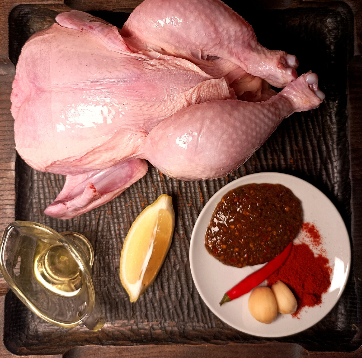 Приветствую, дорогие друзья. Надо признать, что никто не может остаться равнодушным к жареной курочке с такой манящей и ароматной корочкой. А если курочка еще и сочная, то это просто верх блаженства. Сегодня вашему вниманию представляю рецепт наивкуснейшего цыпленка со жгучим томатным соусом. Готовиться цыпленок почти как цыпленок Тапака, но с некоторыми отличиями и по вкусу птичка получается более пикантной и пряной. Так же сделаем к цыпленку острый томатный соус, который идеально оттенит вкус куриного мяса. Нам понадобиться на 2-3 порции: - цыпленок 1,2 – 1,5 кг. (мне нравятся фермерские цыплята зернового откорма) - аджика 3 ст. ложки - паприка 2 ч. ложка - перец чили 1 маленький стручок - лимон 1 крупная долька - чеснок 3 зубчика - оливковое масло 2 ст. ложки - соль 1 ч. ложка Для соуса: - томатная паста 4 ст. ложки - вода 1 чашка - сушеный базилик 1 ч. ложка - перец чили 1 маленький стручок - чеснок 2 зубчика - соль 0,5 ч. ложки - оливковое масло 1 ч. ложка 1. Цыпленка промоем в пр
