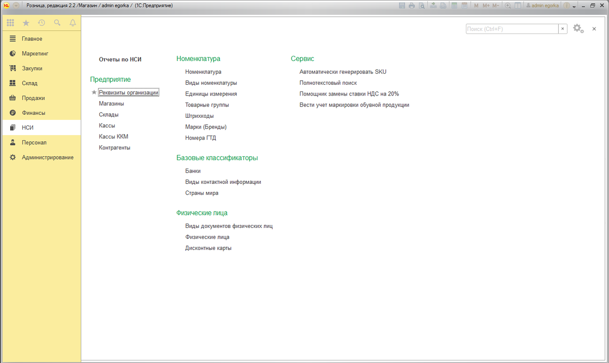 Можно настроить по помощнику настройки кассового места: Администрирование -> продажи ->помощник настройки кассового места и настраиваем как нам надо. Создаём организацию: НСИ ->Реквизиты организации Заполняем реквизиты организации (Наименование в программе, сокращённое наименование полное наименование ФИО, СНО, ИНН) Перейдём к созданию видов цен: Маркетинг -> Виды цен-> ->Создать Создаём 2 вида цен, "закупочную" и "розничную". У "закупочной" снимаем галочку использовать при продаже, и заполняем всё в соответствие со скриншотом У розничной ставим галочку использовать при продаже и в способе задания цены ставим задавать в ручную, если же клиенту требуется сделать расчёт по закупу, то ставим расчёт по другим видам цен и создаём формулу расчёта. Так же если требуется можем зайти. Так же если требуется можем зайти в правила округления и поставить способ округления например до целого. Далее создаём правило ценообразования: Маркетинг ->Ценообразование -> Правила ценообразования -> создать Соз