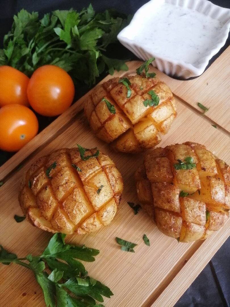 #меню #лента Молодой запечённый картофель в сочетании со сметанно-чесночным соусом никого не оставит равнодушым. Это очень вкусно! 😋 Ингредиенты: картофеля , Заправка:, масла оливкового, соли, паприки молотой, чеснока сушеного, перец чёрный молотый, сметанный соус для подачи:, сметаны, чеснока, укропа, соль, перец чёрный молотый Способ приготовления: Картофель тщательно моем и просушиваем. Делаем надрезы в виде ромбиков. (не дорезаем до конца). Смешиваем все ингредиенты для заправки. Смазываем с помощью кисточки каждую картофелину, в том числе и разрезы. Запекаем в разогретой до 180* духовке до готовности картофеля. У меня ушло ~40 минут. Ориентируйтесь по своей духовке. Подаём с соусом. Для соуса сметану смешиваем с измельчённым чесноком и нарезанным укропом. Солим и перчим по вкусу.