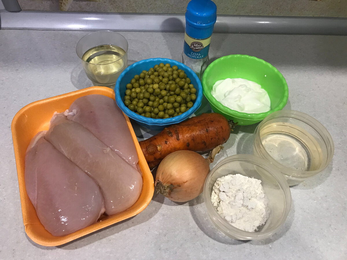 Вкусное и простое куриное филе с морковью и зеленым горошком в сметанном соусе