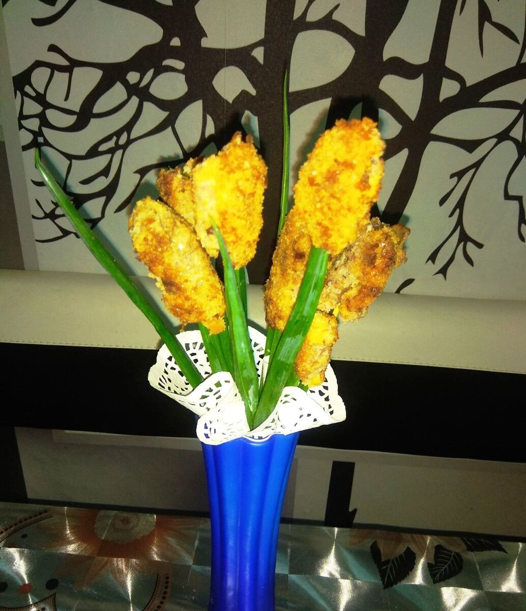Раньше всегда делала из куриной грудки, а сегодня решила сделать из свинины. Прекрасно пошло. Также вкусно, поэтому решайте сами из чего будете делать. Понадобится: 600-700 г мяса для отбивных (или филе куриное) 100 г твердого сыра Зеленый лук (немного в начинку) и ровные стебли для украшения Укроп (или замените на любимую зелень), можно добавить зубчик чеснока 1 яйцо Соль Панировочные сухари Растительное или оливковое масло Творим: 1.Филе нарезаем небольшими отбивными, немного разных размеров (будут камыши побольше и поменьше). Отбить (в пакете) и посолить с обеих сторон. 2.Приготовить начинку: сыр натереть на крупной терке, добавить зелень и лук, яйцо и перемешать. 3.Разложить на отбивные. 4.Свернуть в рулетики и заколоть маленькими деревянными шпажками. 5.Каждый рулетик сначала обмакнуть в масло, затем на тарелке обвалять в сухарях. Кстати, сухари у меня, оказывается, закончились, пришлось домашние сухари размолоть и проблема исчезла). 6.Затем рулетики разложить на противень и запек
