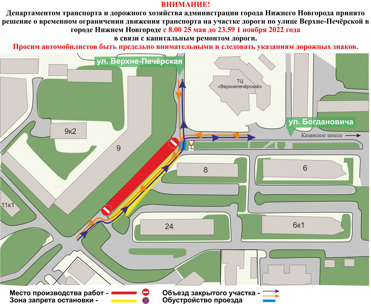 Причина корректировки не называется. В Нижнем Новгороде изменились сроки начала ремонта проезжей части на улице Верхне-Печерской, сообщили в Главном управлении по строительству и ремонту метрополитена, мостов и дорожных сетей. Участок дороги вдоль дома № 9 по улице Верхне-Печерской планировали перекрыть для движения транспорта 25 мая, но этого не произошло. В МКУ «ГУММиД» отметили, что работы начнутся 7 июня. Причины изменения сроков не называются. На данном участке будет проводиться капитальный ремонт проезжей части. Объехать закрытую зону можно будет по прилегающему участку улицы с выездом на перекресток улиц Верхне-Печерской и Богдановича в обратном направлении. На указанном участке запретят остановку и стоянку автомобилей.