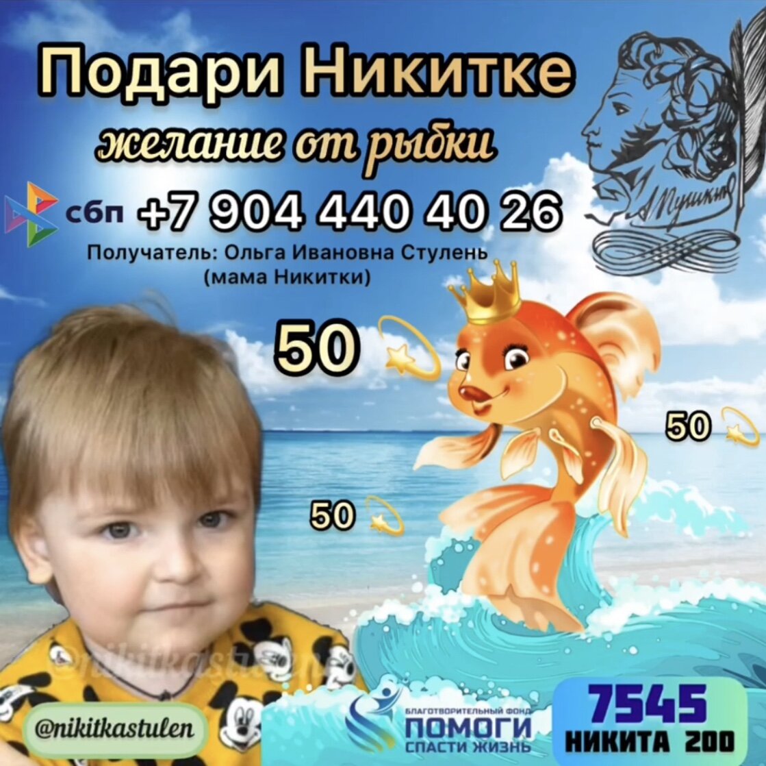 🐠ПОДАРИ НИКИТКЕ ЖЕЛАНИЕ ОТ РЫБКИ 🐠 Все малыши любят сказки! Конечно, ведь в них столько чудес! Сегодня, в день рождения А.С. Пушкина, на сказках которого выросло не одно поколение, мы предлагаем вам поделиться с малышом Никиткой частичкой волшебства 🪄 Пожертвовав на указанные реквизиты 50 рублей, вы совершите маленькое чудо 💫 и подарите 🎁 Никитке желание от рыбки. И хотя в сказке золотая рыбка исполняла три желания, нам бы хотелось загадать ей всего одно: чтобы наш сыночек ВОВРЕМЯ получил лечение и мог ЖИТЬ нормальной жизнью, как все детки… Мы верим🙏🏻, что каждое из подаренных вами желаний для малыша в итоге сложится в одно большое и чудо действительно случится! 💖 📝Всю информацию о том, как можно помочь, можно найти на странице Никитки @nikitkastulen ##икиткастулень ✅Стулень Никита (3г.) ✅Ростовская область ст. Кривянская ✅Диагноз – Первичный иммунодефицит. ХЛП2 📌Сбор на пересадку костного мозга в Швейцарии ‼Сумма сбора: 50 047 200 руб. 📝РЕКВИЗИТЫ ДЛЯ ПОМОЩИ: (можн