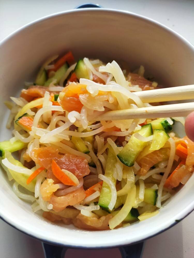 Когда страсть как хочется путешествовать, но отпуск ещё далеко - идём на кухню делать салат в корейском стиле. Ведь кулинария это лучшее путешествие! #салат #Фунчоза Ингредиенты: свежей семги, средних огурца, морковь, лапши Фунчоза, Маринад, Сок одного лимона, Соевого соуса, Острый перец , Корень имбиря, Кунжутного масло, Семена кинзы или свежая кинза Способ приготовления: Для начала нужно замариновать семгу. Нарезать тонкими полосками. В пиалке соединить все ингредиенты для маринада и залить рыбу Дать рыбе пропитаться маринадом пару часов, поставив в холодильник. Тем временем залить фунчозу кипятком и оставить примерно на час. Нарезать соломкой морковь и огурцы. Смешать с фунчозой, рыбой и маринадом. Дать салату постоять несколько часов в холодильнике.
