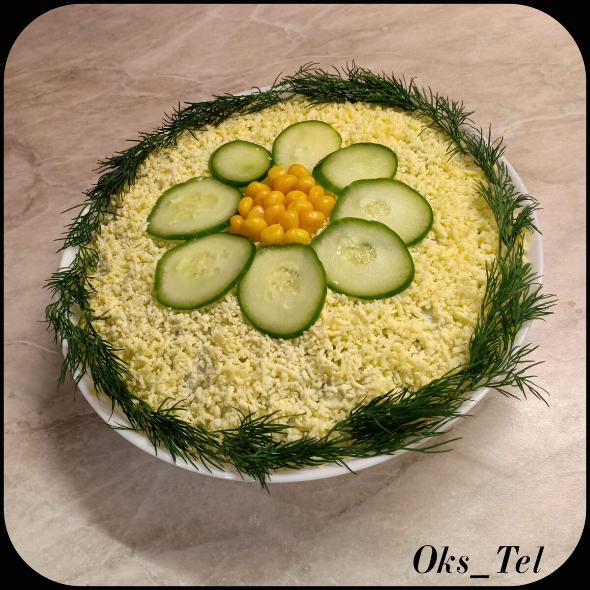 Серия "Именные салаты". Безупречный слоеный салат с печенью трески. ПОНАДОБИТСЯ: - 250г печени трески, - 1 стакан отварного риса (лучше длиннозерного), - 4 яйца, сваренных вкрутую, - 2 свежих огурца (один средний, другой длинный и не очень толстый), - 150г консервированной кукурузы, - майонез, - листья салата для украшения, - зелень свежей петрушки и лука, - по вкусу - белый молотый перец. ПРИГОТОВЛЕНИЕ: 1. Один огурец нарезать небольшими кубиками. Второй огурец лучше взять длинный и не очень толстый: он понадобится для украшения. 2. Небольшой пучок зеленого лука (без белых кончиков) мелко порубить ножом. 3. Огурцы и лук переложить в небольшую миску и перемешать. 4. Яйца разрезать на две части, отделить белки от желтков. Измельчить их по-отдельности: белки натереть на крупной терке, а желтки – на мелкой. 5. Печень трески вынуть из банки (жидкость оставить в банке, она еще понадобится), переложить в небольшую миску и измельчить вилкой до однородности. 6. Рис выложить в отдельную посуд