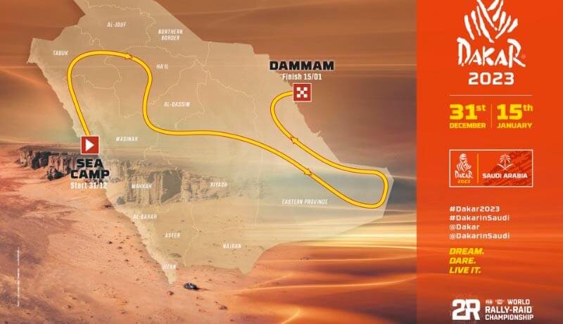 Знаменитое ралли Дакар возвращается в Саудовскую Аравию в четвертый раз в 2023 году, но с новым маршрутом и различными изменениями правил, о которых было объявлено накануне. После того, как в последние годы предпочтение отдавалось кольцевому маршруту, ралли снова будет двухточечным, начиная с пляжа у Красного моря и заканчивая Даммамом у Персидского залива на противоположном побережье страны. Маршрут начинается с бивуака «Морской лагерь», направляясь на север через провинции Медина и Табук, а затем начинается восточный путь, который пересекает Хаил, Аль-Касим, Эр-Рияд и Восточную провинцию. Оказавшись в Восточной провинции, крупнейшей в Саудовской Аравии, ралли пересекает огромную пустыню под названием Руб-аль-Хали (Пустой квартал), прежде чем отправиться в Даммам. Хаиль и Эр-Рияд знакомы с автогонками, поскольку обе провинции были местами проведения ралли 2022 года, а первая была серединой ралли 2021 года. Провинция Эр-Рияд также принимает гонки Формулы E. Ралли будет состоять из четы