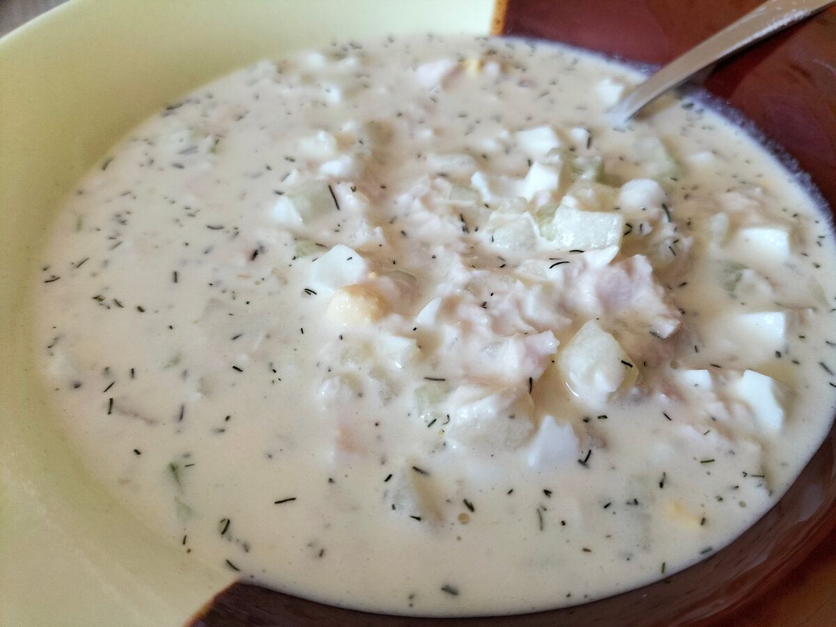Летом каждый, хоть раз да приготовит окрошку. Делают её по разному - традиционную на квасе, на кефире или на молочной сыворотке. Каждая по своему вкусна и хороша. Я хочу вам предложить свой - Особенный рецепт окрошки - освежающее, сытное угощение на лето Продукты нужны простые, но есть свои нюансы в приготовлении. Всё расскажу по порядку - отличный летний рецепт. Ингредиенты: Приготовление окрошки Отвариваем куриное филе в слегка подсоленной воде. Бульон не выливаем, понадобится чуть более 1 литра бульона, примерно 1.1-1.2 литра. Отвариваем картошку и яйца. Далее мелко нарезаем отваренное мясо, картошку, яйца. Кстати картошку с яйцами удобно измельчать, продавливая через сеточку. С огурцов срезаем кожицу и также мелко нарезаем. Засыпаем все ингредиенты в кастрюлю и перемешиваем. Добавляем майонез и зелень. У меня был сушёный укроп. Тщательно всё перемешиваем. Получился салат)), вот из него и получается окрошка. Вот теперь надо влить бульон, но сделать это правильно. Не заливайте сразу