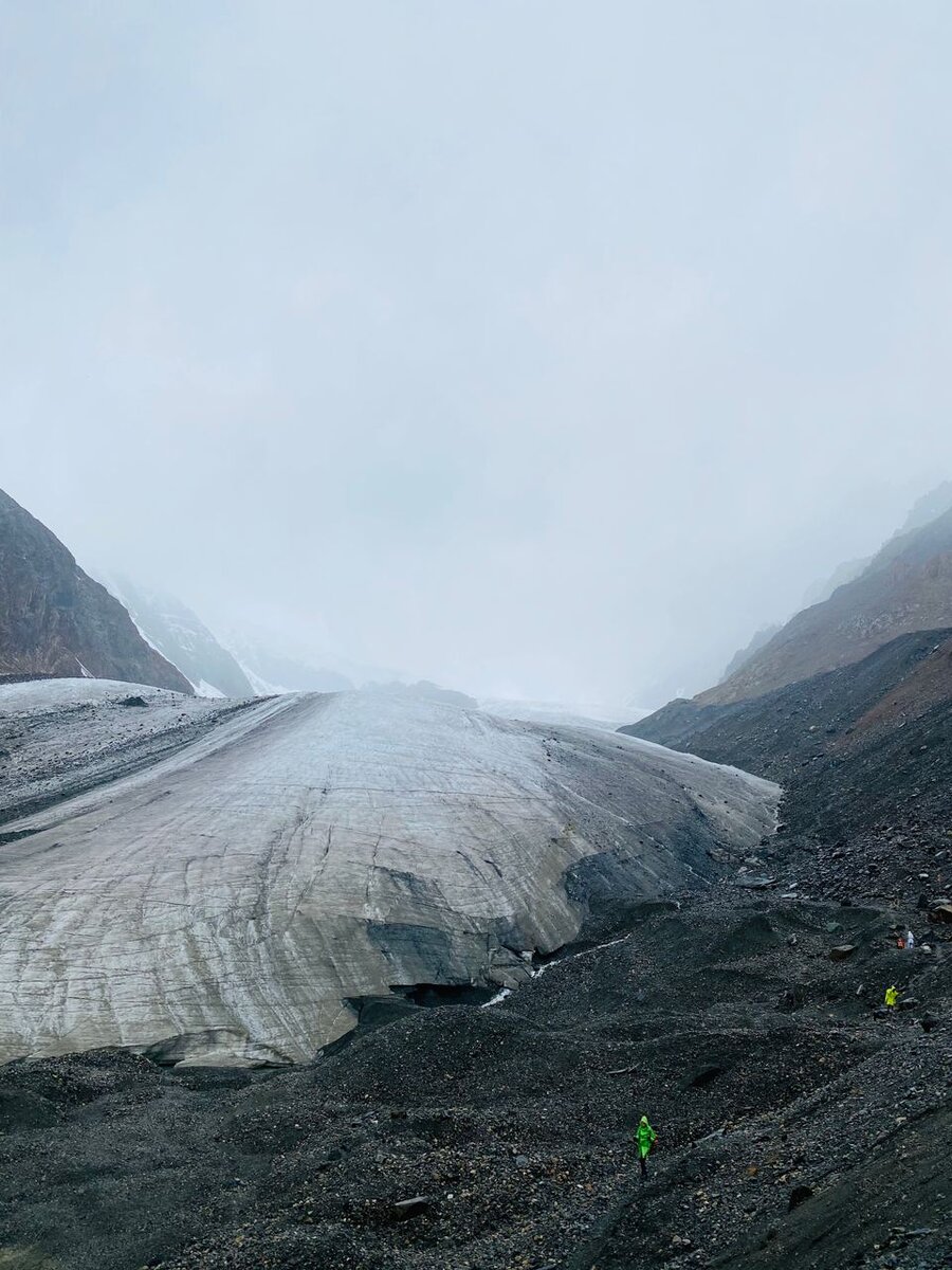 Величественные горы держали нас, оберегали и заботились, даже зефирно-розовый спортивный костюм моей подруги (а что? пенсионерская же прогулка и фотки?) остался не тронутом в этом царстве времени, камня, льда и холода. Я бесстрашно шла вперед доверяя этой защите и не чувствуя усталости. Когда тело перестало справляться с холодом ледника и моросящего дождя (а также сверлящим взглядом моих друзей, которые хотели повернуть обратно километров 10 назад), мы повернули назад.