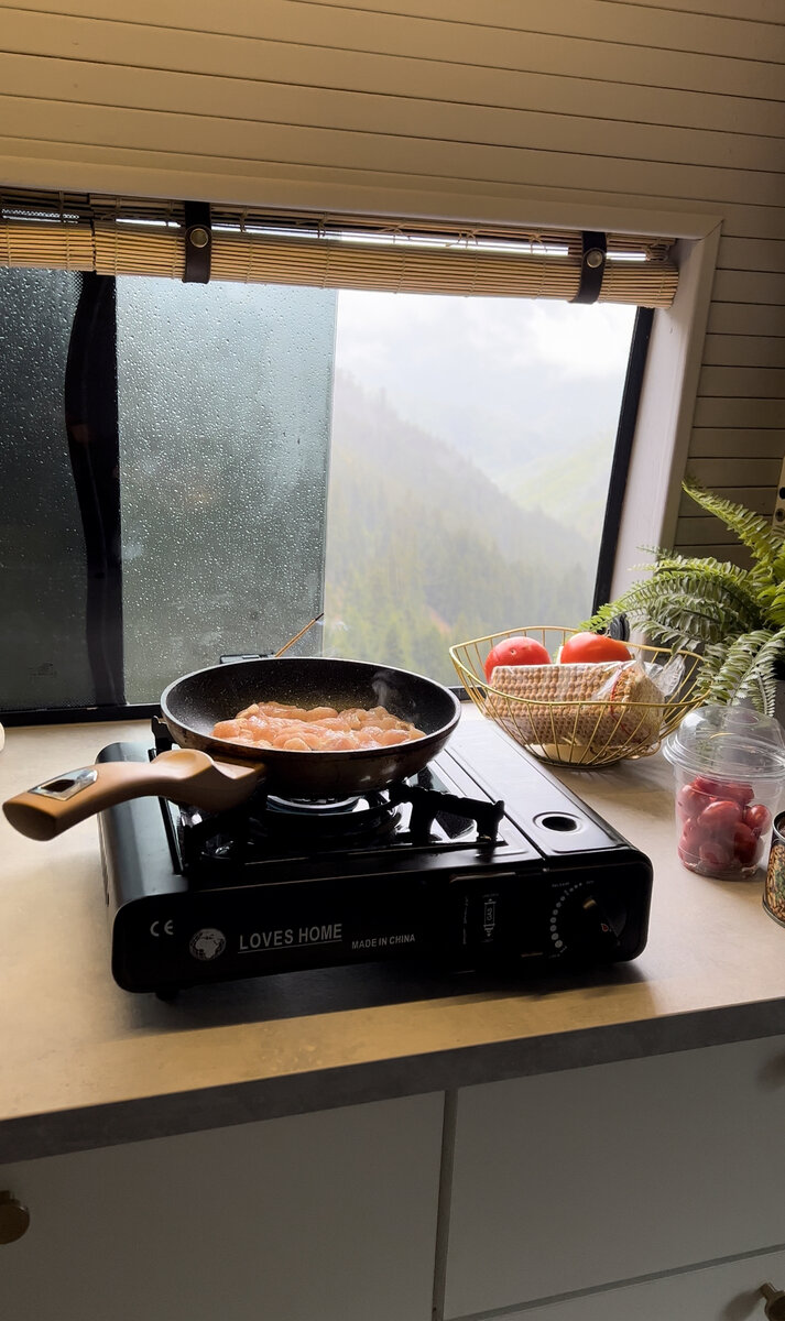 Уже месяц мы живём в доме на колёсах без стандартной газовой или индукционной плиты. Не потому что нам она не нужна, а просто потому что мы не нашли в России ту, которая нам нравится. Зато уже присмотрели газовую в Турции. Уже месяц мы готовим на китайской походной плитке, которая нас полностью устраивает. Плитка фирмы Loves Home. Куплена была в ближайшем магазине возле дома. В ней используются маленькие баллончики, которые мы успели урвать по супер цене в сети магазинов Светофор. Это магазины-склады, которые предлагают товары по уникальным ценам. Тут мы увидели баллончики по 64 рубля, поэтому взяли сразу около 40 баллонов. Мы слышали, что они быстро заканчиваются и хватает баллона чуть ли не на приготовление еды для одного приема пищи на двоих. Это очень смущало, но деваться уже было некуда, всё куплено. Нам не терпелось проверить, насколько же хватит баллончика лично нам и мы решили провести эксперимент и записывать все разы использования одного баллона от и до. Вот, что