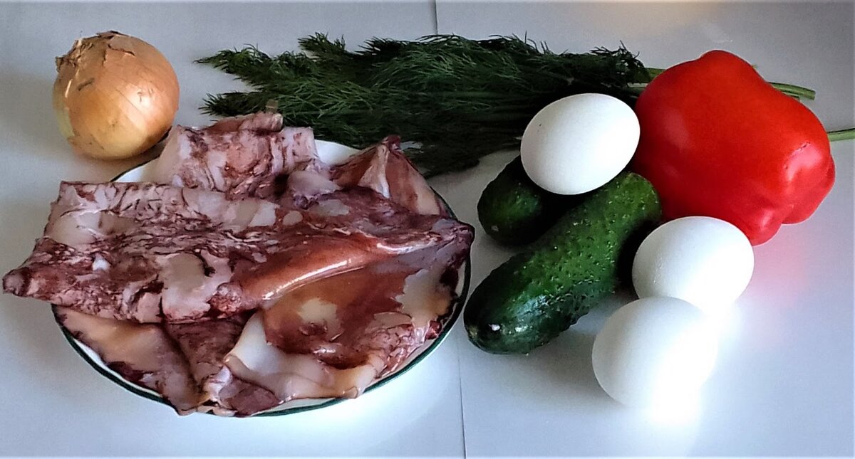Сегодня я приготовлю простой и быстрый салат с кальмарами. Такой салат понравится многим. Он очень нежный и питательный. Для приготовления мне нужно: Приступим Подготовлю вначале кальмары. У меня кальмары замороженные, неочищенные. Размораживаю кальмары при комнатной температуре. Заливаю тушку кальмара кипятком, оставляю на 10 -15 секунд. Кожица сама сворачивается. Под струей холодной воды смываю кожицу. Затем разрезаю тушку и вычищаю внутренности. Очищенные кальмары складываю в емкость и заливаю кипящей водой. Оставляю на 40 секунд (дольше не надо, будет твердый). Промываю в холодной воде. Кальмары готовы. Нарезала кальмары соломкой, не мелко. Болгарский перец - обожгла кожицу на огне до черного. Обожженный перец положила в пакет на 15 минут. Так кожица легче чистится. Перец готов. Нарезала перец соломкой. Огурец частично очистила. Убрала серединку с семечками. Нарезала соломкой наискосок. Л