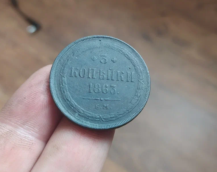 Ох уж эти монетки плоского чекана. Нет у меня ни одной, чтобы радовала глаз. И вроде бы цвет нормальный, но затертая. Или вроде бы профиль еще виднеется, но цвет не нравится. Всех меньше у меня трехкопеечников. Всего 5 штук разных годов. Вот один из них: Цвет получился этакий коричнево-зеленый. Вроде бы всё видно, даже буковки ЕМ (у этих монет даже буквы двора часто затерты). Год 1863 - совершенно нередкий, хотя тираж (как указано в каталоге) всего 3,9 миллиона экземпляров. А изначально монетка была вот такой: Очень хотелось сохранить зеленоватый цвет, но, видимо, была не судьба. На аверсе вдоль края под "загрязнениями" обнаружилась толстая зеленая чернота. На реверсе тоже - но меньше. Пришлось всеми правдами и неправдами убирать всё вредное. Зеленый оттенок сохранить не удалось, иначе бы были пятна. Но хотя бы монета стала коричневой с едва заметной зеленОй. И без каверн. Лучше бы это был 1865 год. На одном аукционе монета 3 копейки 1865 года была продана аж за 4,8 миллиона